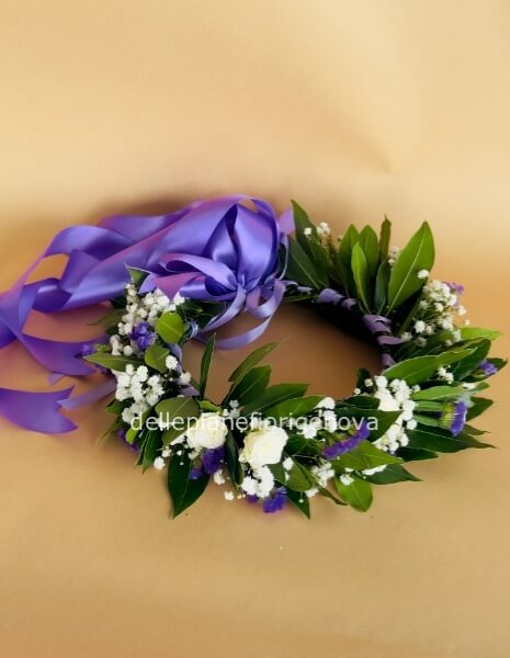 Classica coroncina di alloro con foglie verdi di alloro mischiate al bianco del velo da sposa che ricopre l'intera corona insieme a delle stupende roselline che risalteranno alla perfezione, nella scelta della coroncina potete scegliere se togliere o aggiungere dei fiori, scriveteci anche il colore del nastro che vorrete in base alla vostra facoltà. Per qualsiasi chiarimento scriveteci al 3479993952