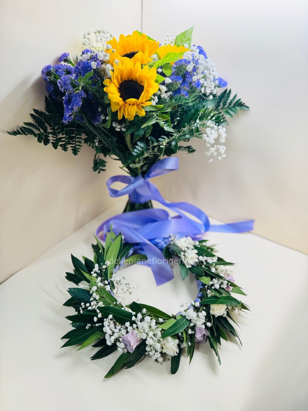 Come in descrizione questo prodotto contiene una Coroncina di alloro e un Bouquet Laurea, dove potrai scegliere e comunicarci, nelle "note per il fiorista ", colore dei nastri.